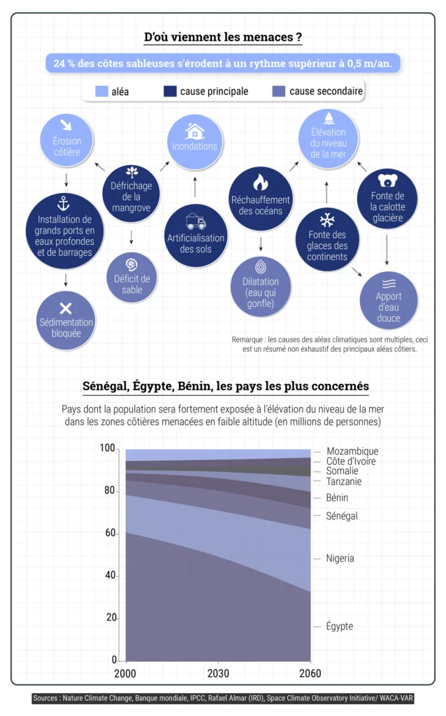 Un phénomène potentiellement dévastateur en Afrique de l’Ouest, ou un tiers de la population vit en zone côtière. « Pour l’instant, l’érosion en Afrique de l’Ouest est principalement due au déficit de sable provoqué par la mise en place de barrages hydroélectriques, qui provoquent un déficit de sédimentation », explique Rafael Almar, océanographe physicien à l’Institut de recherche pour le développement (IRD). « L’apport de sable a ainsi largement diminué dans les rivières. Quant aux inondations qui frappent les zones côtières, elles peuvent être dues au défrichement de la mangrove dans les estuaires, mais aussi engendrées par l’urbanisation galopante. »