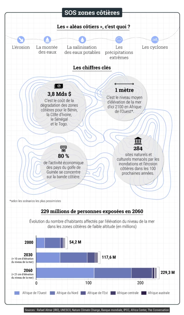 En Afrique, c’est déjà une réalité face à laquelle les populations côtières doivent s’adapter, tant bien que mal. Écoles, maisons, cimetières… Du Sénégal au Bénin en passant par le Maroc, des pans entiers de quartiers sont peu à peu grignotés par les eaux. Parfois, il s’agit de monuments historiques ou naturels, inscrits au patrimoine de l’humanité, à l’image des sites archéologiques dans le nord du Sinaï, en Égypte, ou du parc national du Sine Saloum, dans le sud du Sénégal.