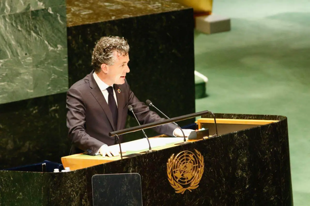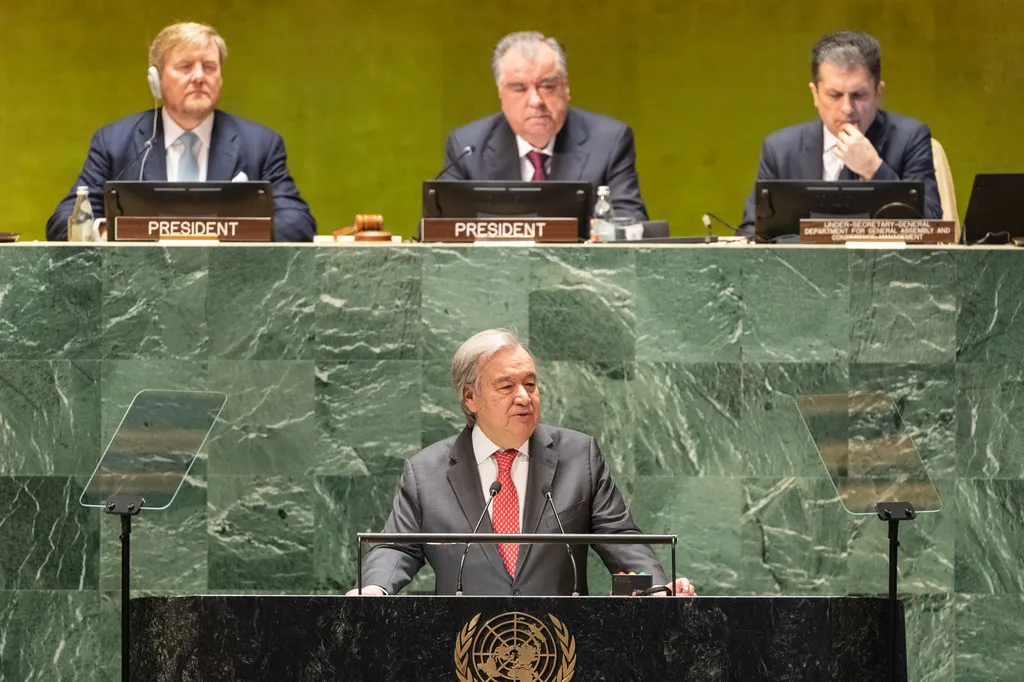 Le Secrétaire général de l’ONU, António Guterres, s’adresse à l’ouverture de la Conférence des Nations Unies sur l’eau, accompagné du roi des Pays-Bas Willem-Alexander et du Président du Tadjikistan, Emomali Rahmon.
