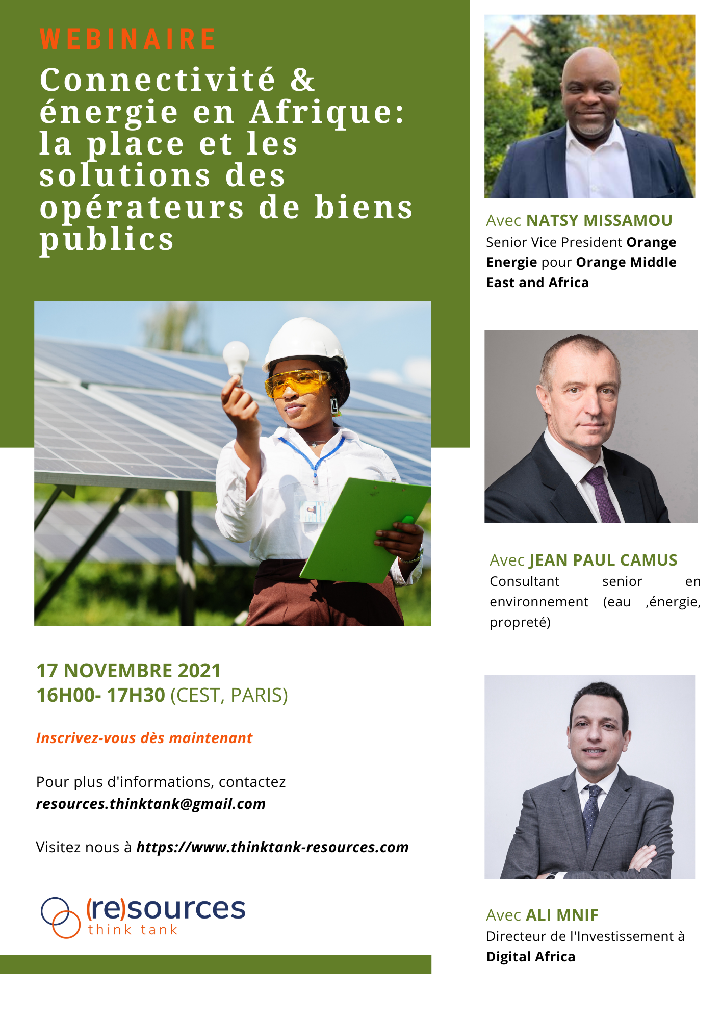 Connectivité & énergie en Afrique: la place et les solutions des opérateurs de biens publics + Ajouter à mon Agenda Google + iCal / Outlook export Date Nov 17 2021 Expired! Heure All Day Partagez cet événement
